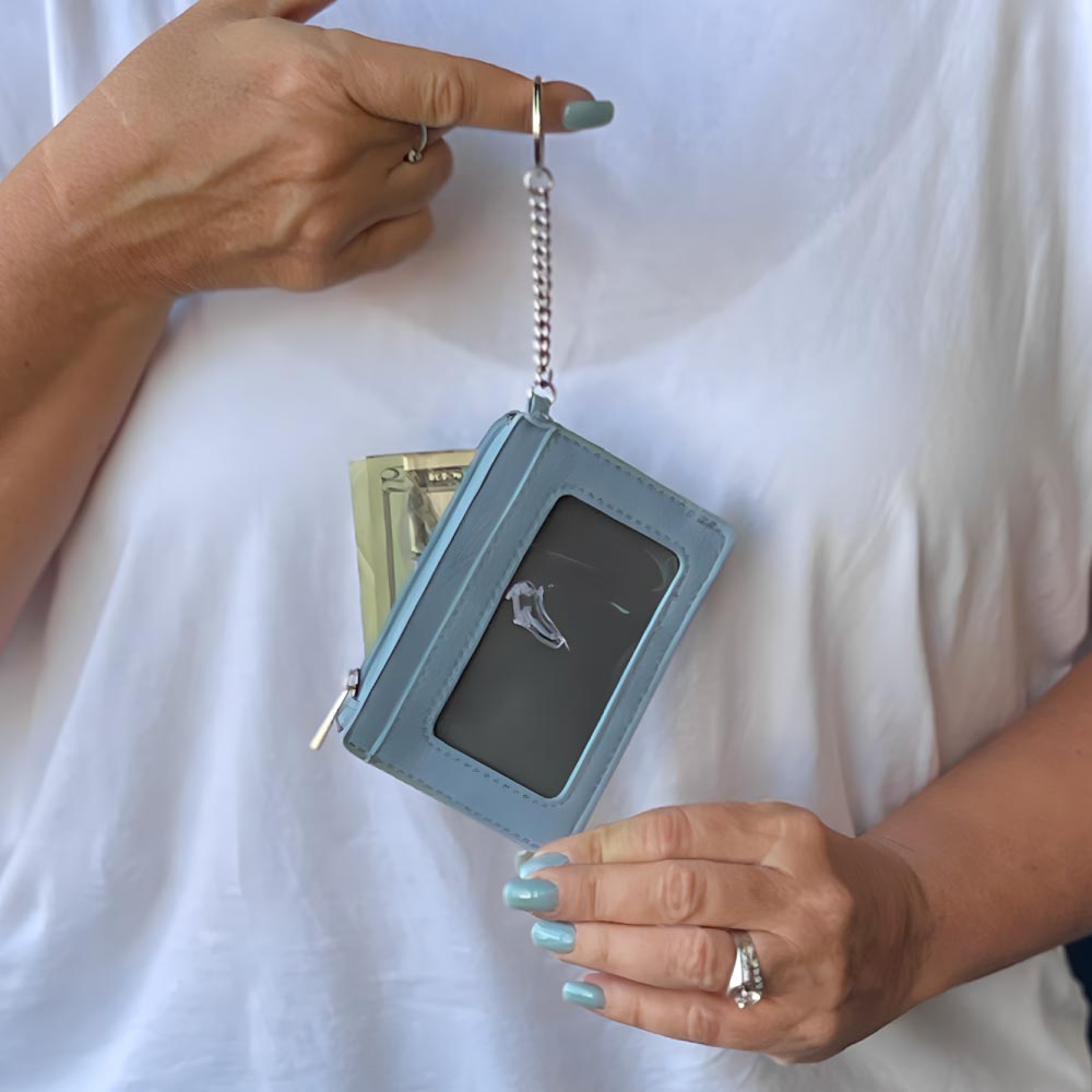 This accessory is cute and compact – a perfect wallet to attach to a bag, keys, belt loop, and more! Comes with 3 card holders, a clear ID compartment, bill compartment and even a zipper pocket to hold your change!