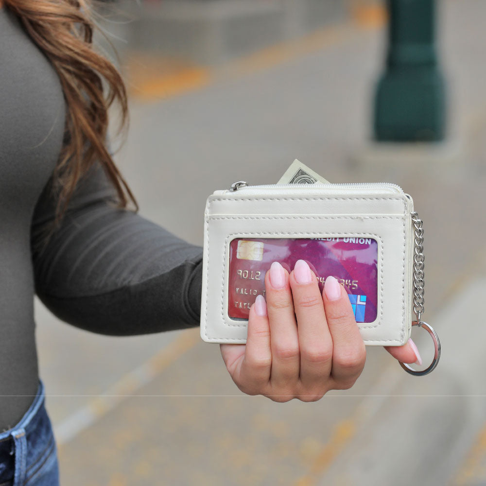 This accessory is cute and compact – a perfect wallet to attach to a bag, keys, belt loop, and more! Comes with 3 card holders, a clear ID compartment, bill compartment and even a zipper pocket to hold your change!