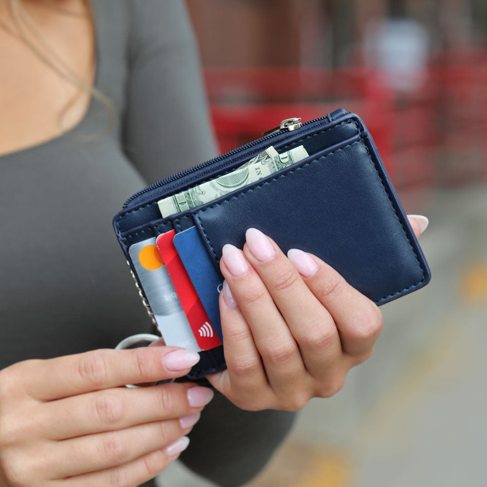 This accessory is cute and compact – a perfect wallet to attach to a bag, keys, belt loop, and more! Comes with 3 card holders, a clear ID compartment, bill compartment and even a zipper pocket to hold your change!