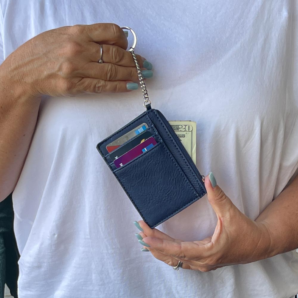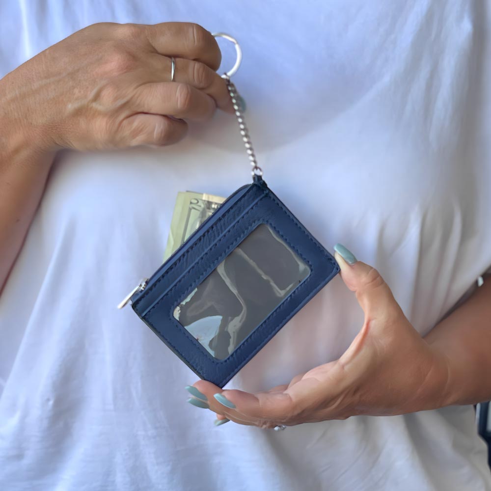 This accessory is cute and compact – a perfect wallet to attach to a bag, keys, belt loop, and more! Comes with 3 card holders, a clear ID compartment, bill compartment and even a zipper pocket to hold your change!