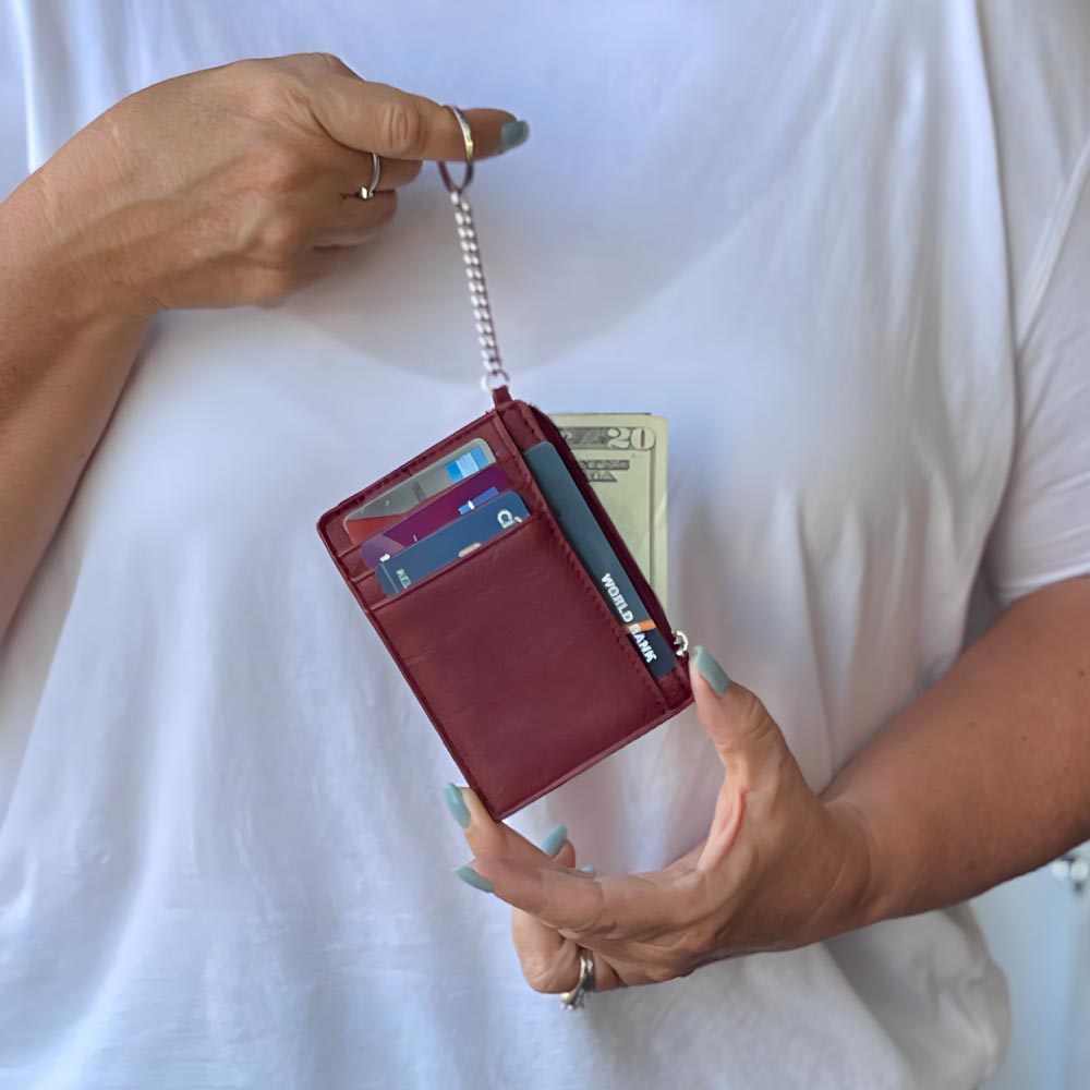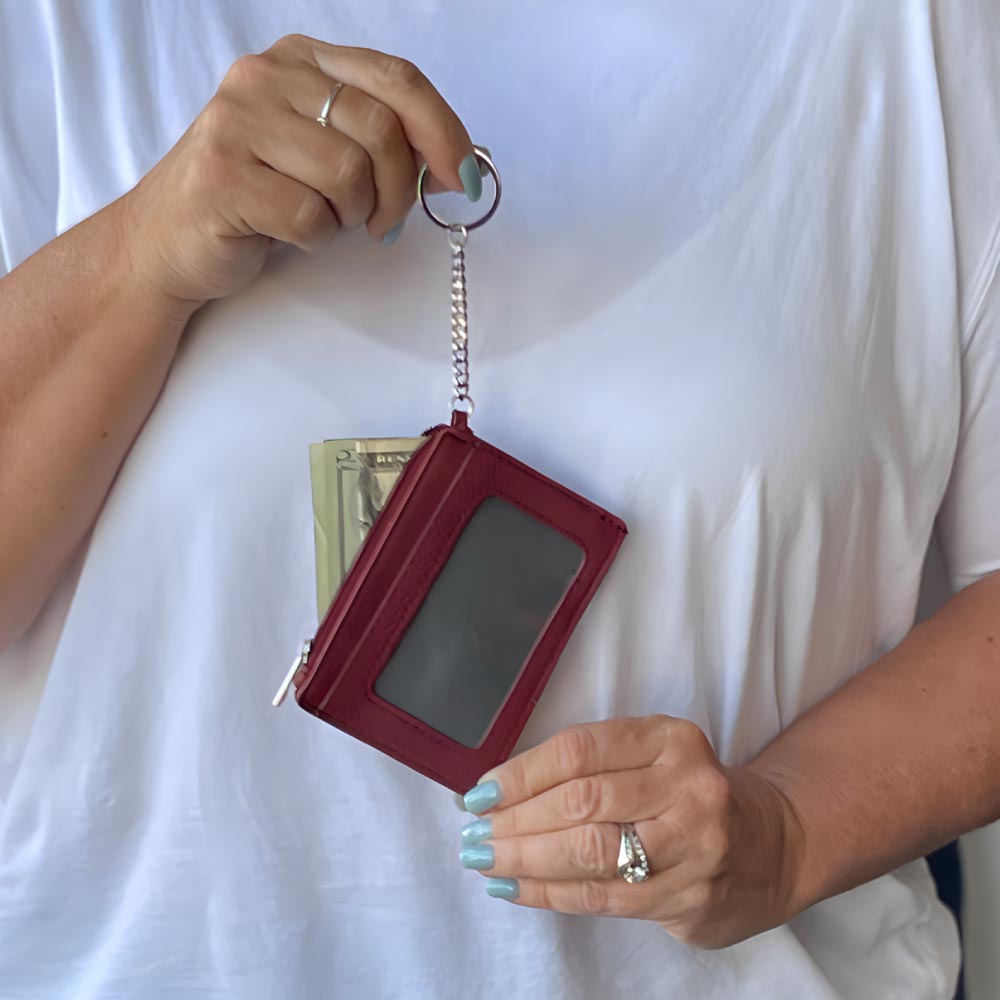 This accessory is cute and compact – a perfect wallet to attach to a bag, keys, belt loop, and more! Comes with 3 card holders, a clear ID compartment, bill compartment and even a zipper pocket to hold your change!