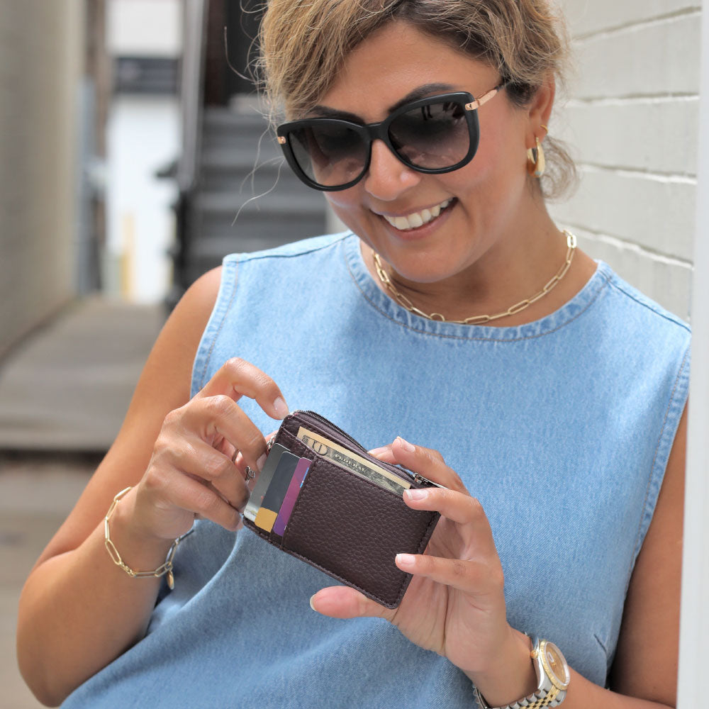 This accessory is cute and compact – a perfect wallet to attach to a bag, keys, belt loop, and more! Comes with 3 card holders, a clear ID compartment, bill compartment and even a zipper pocket to hold your change!