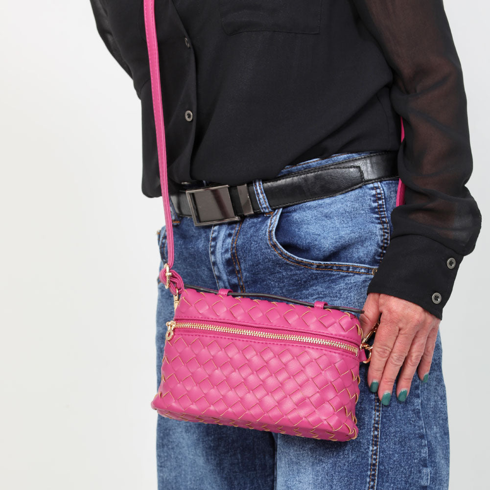 Introducing a brand-new, on-trend design from K. Carroll Accessories. The vegan leather weave adds a rich, sophisticated texture that gives this bag its effortlessly chic appeal. Designed with versatility in mind, it features both a collapsible satchel handle and an adjustable crossbody strap—so you can carry it your way. Inside, you’ll find a convenient zipper pocket and two built-in RFID-protected card sleeves. The exterior zipper stylishly wraps around the sides, opening wide for easy access to your phone and everyday essentials.